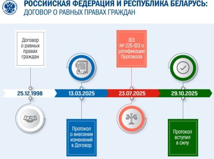 29 октября 2025 года вступил в силу Протокол о внесении изменений в Договор между Российской Федерацией и Республикой Беларусь о равных правах граждан.